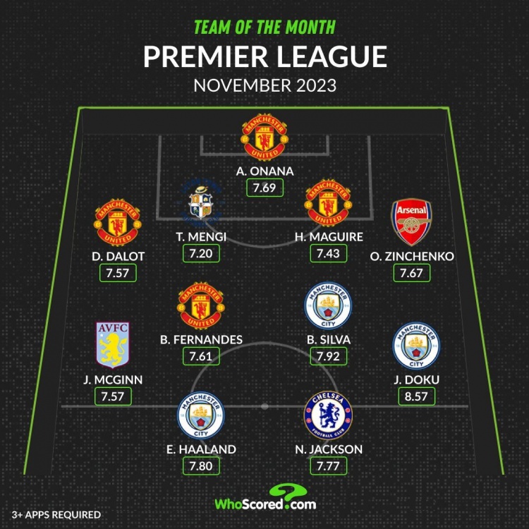 WhoScored英超月最佳阵:奥纳纳、马奎尔入选,杰克逊、多库在列