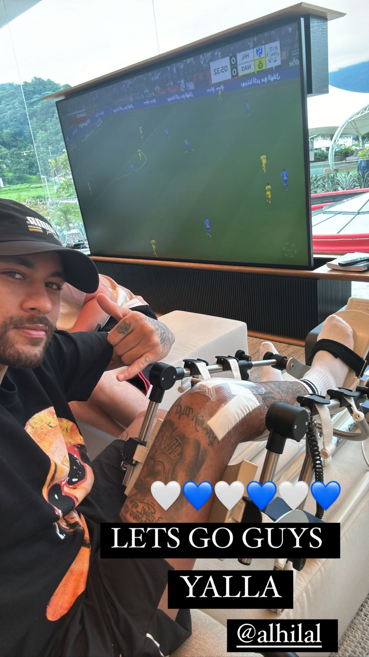 心系球队内马尔架着伤腿观看利雅得德比:加油伙计们!
