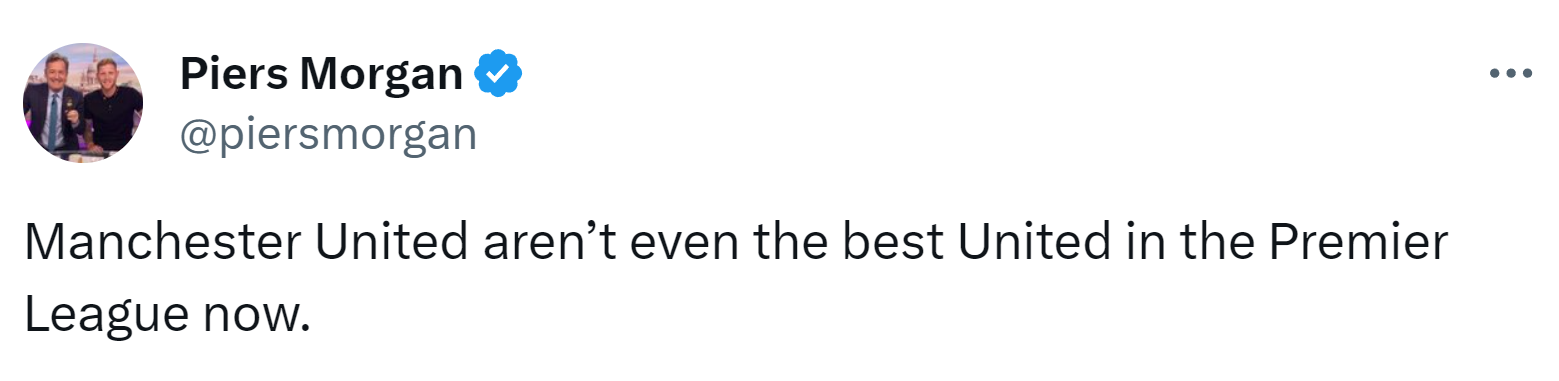 12月3日讯 曼联0-1不敌纽卡斯尔联,著名主持人摩根在社媒发动态调侃。摩根:曼联现在甚至不是英超中最好的“联”了。