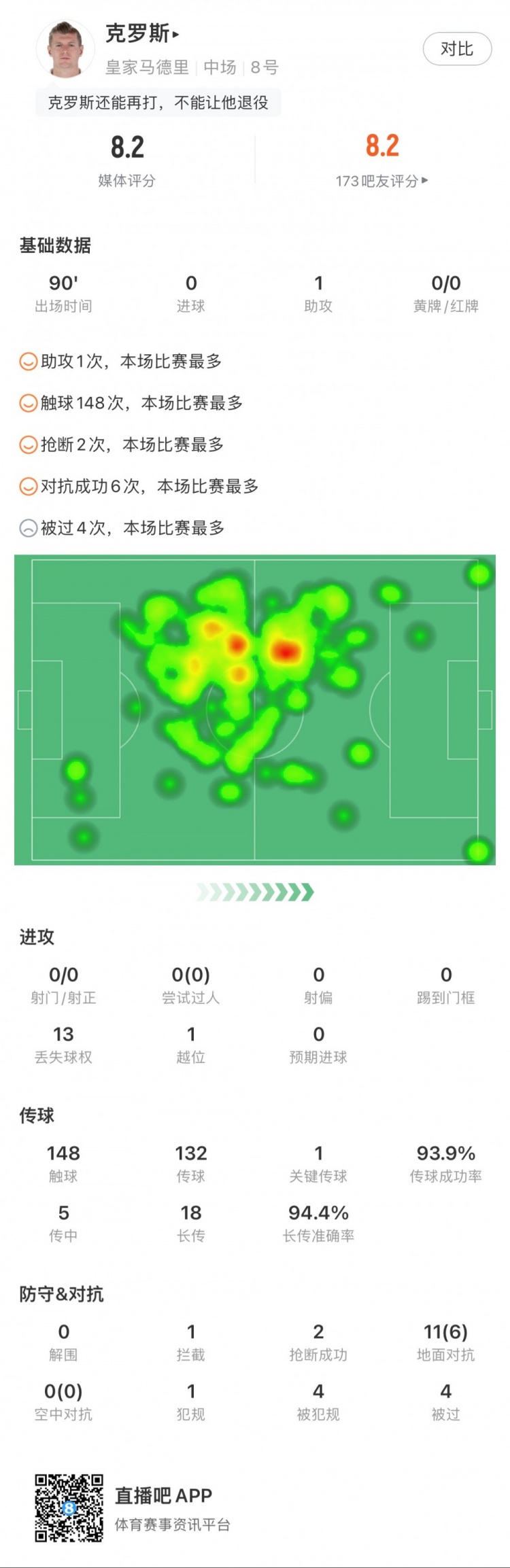 克罗斯全场数据:1次助攻,传球成功率94%,17次到位长传