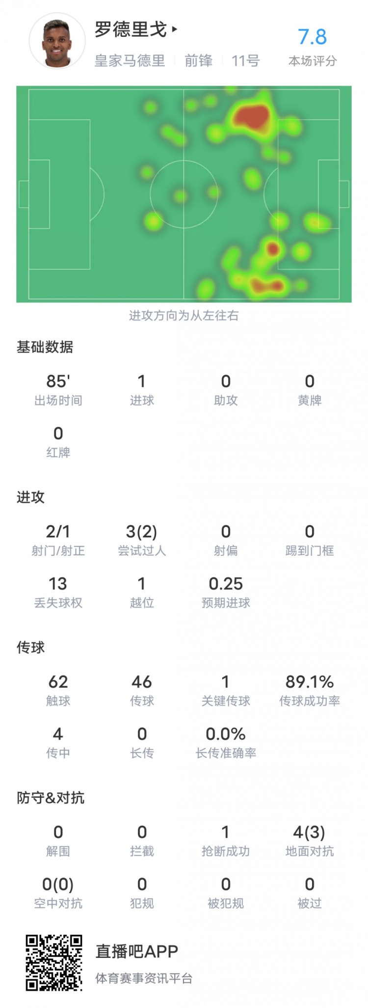 罗德里戈本场数据:1进球1关键传球2过人成功,评分7.8