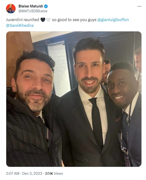 马图伊迪晒与布冯、赫迪拉合照:尤文蒂尼重聚,很高兴见到你们