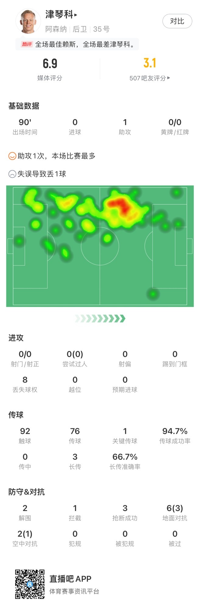 12月3日讯 阿森纳本轮2-1击败狼队,津琴科打满全场,他助攻1次,失误导致丢1球,获评6.9分。