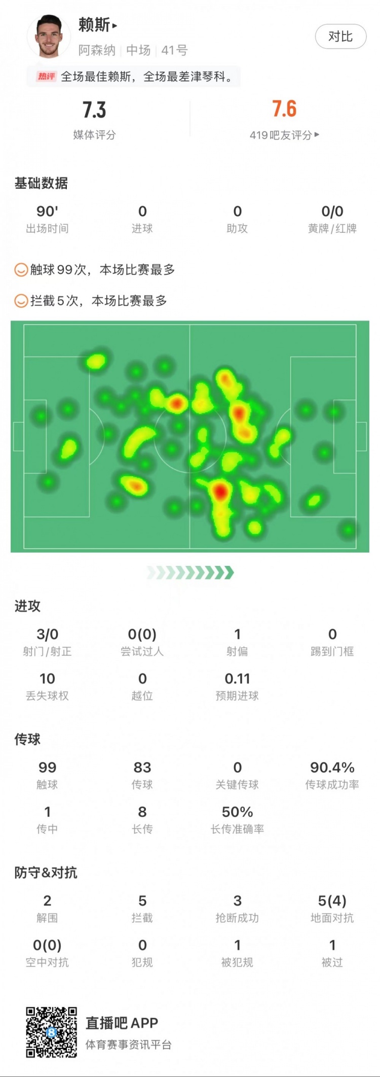 赖斯全场数据:5次拦截全场最高,5次夺回球权,3次抢断