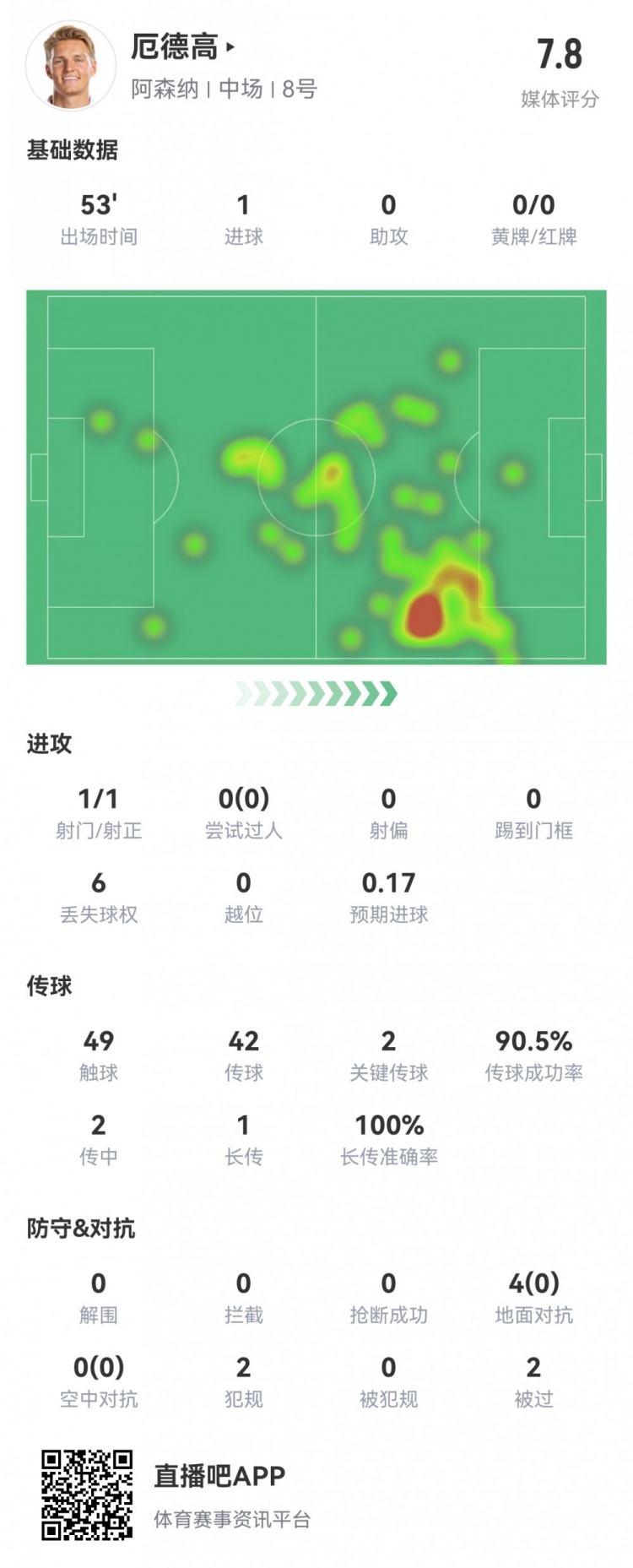 厄德高半场数据:1射1正1进球 传球成功率90.5% 评分7.8全场最高