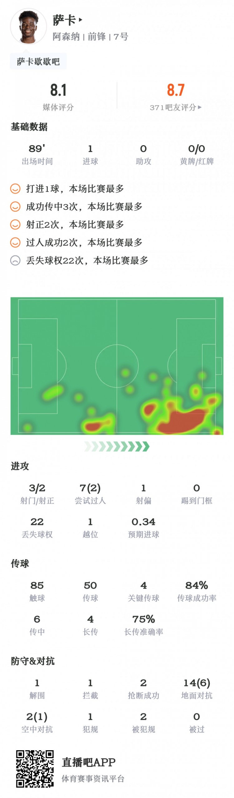 萨卡数据:3射1进球&4关键传球,7次过人2次成功,评分8.1