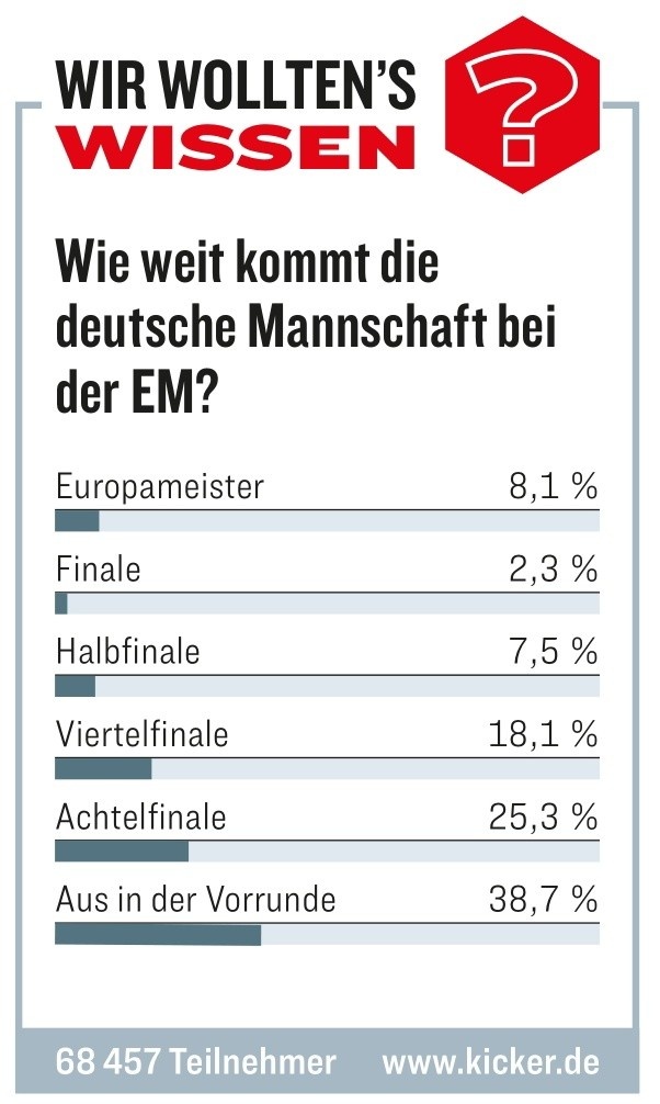 明年欧洲杯的抽签结果出局,东道主德国与苏格兰、匈牙利、瑞士同处A组,德国媒体《踢球者》组织球迷投票,预测德国队在欧洲杯上的成绩,38.7%球迷预测德国队小组出局,25.3%的球迷预测德国止步16强。