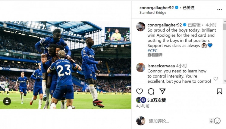 赛后加拉格尔在社交媒体上晒出庆祝的照片,并写道:“为小伙子们今天的表现感到非常骄傲,一场很棒的胜利!为红牌和让队友处于那种境地而道歉,球迷们的支持一如既往。”