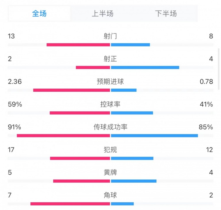巴萨1-0马竞全场数据:射门13-8,射正2-4,重要得分机会6-1