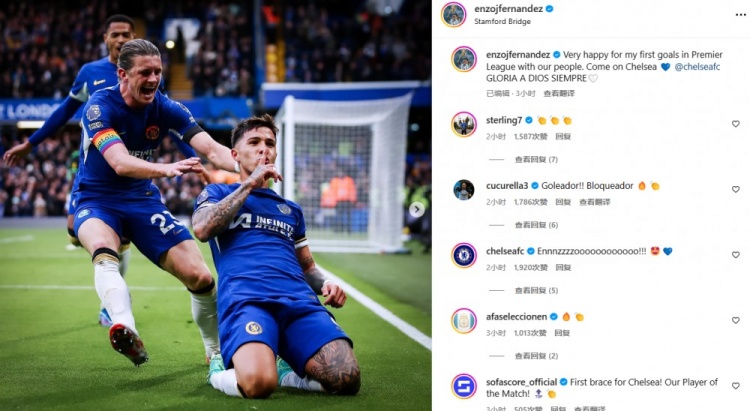 12月4日讯 英超第14轮,切尔西3-2布莱顿,本场比赛恩佐梅开二度,收获个人英超首球。赛后,恩佐更新了社媒动态:很高兴在主场球迷面前取得我在英超的第一个进球,加油