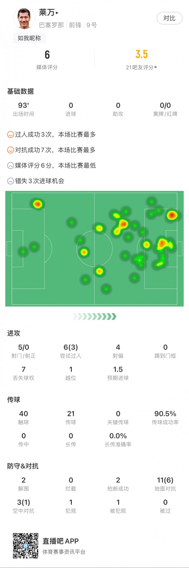 莱万全场数据:5次射门0次射正,错失3次良机,获评6.0分最低