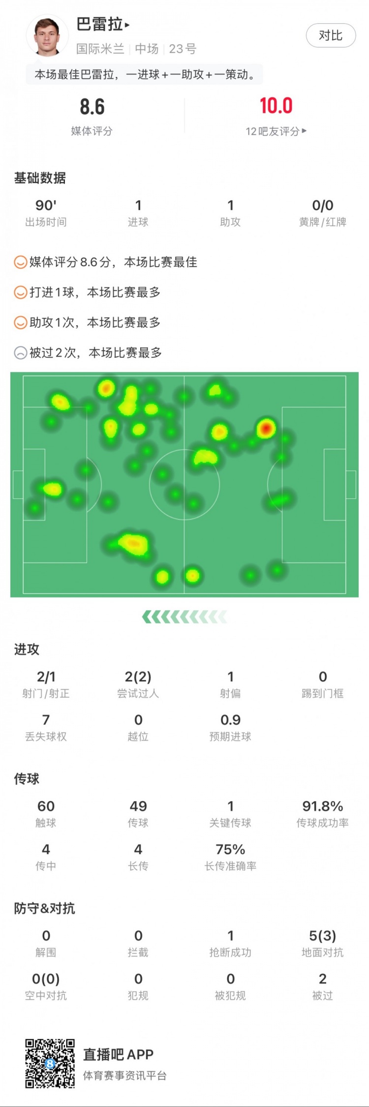 巴雷拉全场数据:1球1助,2次成功过人,获评8.6分全场最高