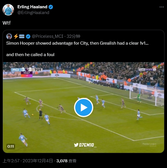 不敢相信!哈兰德转发曼城单刀被吹停视频,配文:WTF