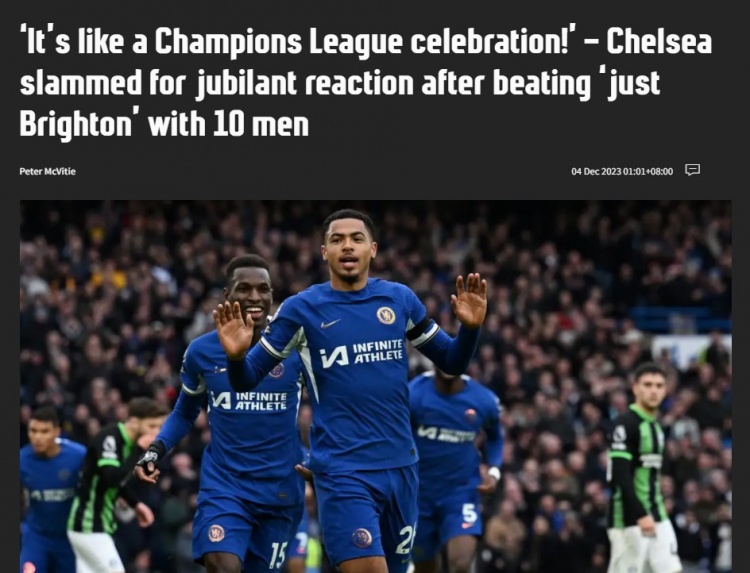 赛后体育节目主持人理查德-凯斯(Richard Keys)表示:“虽然我不太愿意回顾去年阿森纳逆转战胜富勒姆赛后我说的话,但今天这场比赛,对手只是布莱顿,切尔西球员就像庆祝欧冠夺冠一样,他们看起来激动得很。”