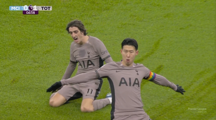 12月4日讯 英超第14轮,曼城主场对阵热刺。开场6分钟,热刺打出快速反击,库卢长传助攻,孙兴慜甩开多库杀入禁区,右脚抽射破门!热刺1-0领先曼城!换个视角再看孙兴慜