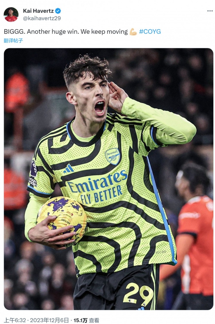 12月6日讯 在英超第15轮比赛中,哈弗茨取得进球,帮助阿森纳客场4比3击败卢顿。赛后哈弗茨在社交媒体上晒出庆祝进球的照片,并写道:“重大!又一场重要胜利,我们继