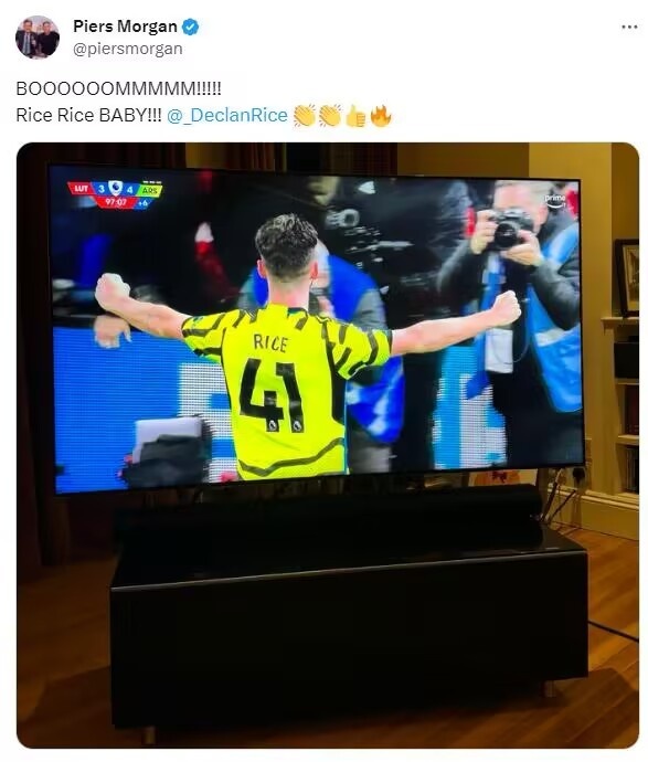 12月6日讯 阿森纳客场4-3战胜卢顿,赖斯第97分钟绝杀!摩根在社媒激动地庆祝!