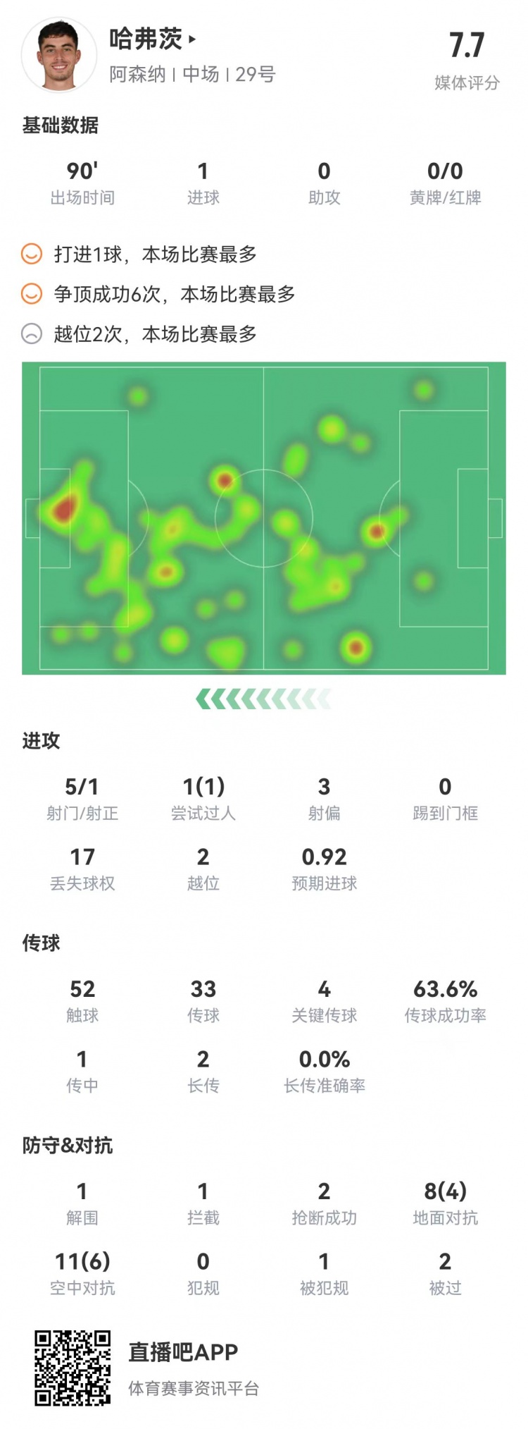 数据真像后卫哈弗茨数据:5射1正1进球 1解围1拦截2断19对抗