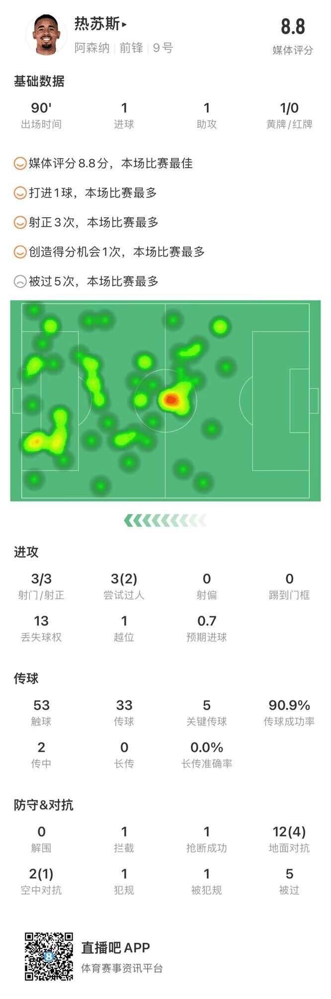 12月6日讯 在今日凌晨进行的一场英超联赛中,阿森纳4-3卢顿。枪手前锋热苏斯首发出战,贡献传射,评分8.8全场最高。本场比赛热苏斯具体数据如下:上场时间90分钟
