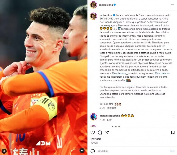 12月7日讯 回到巴西的莫伊塞斯,再次更新社媒表达了他对于山东泰山的深厚感情。