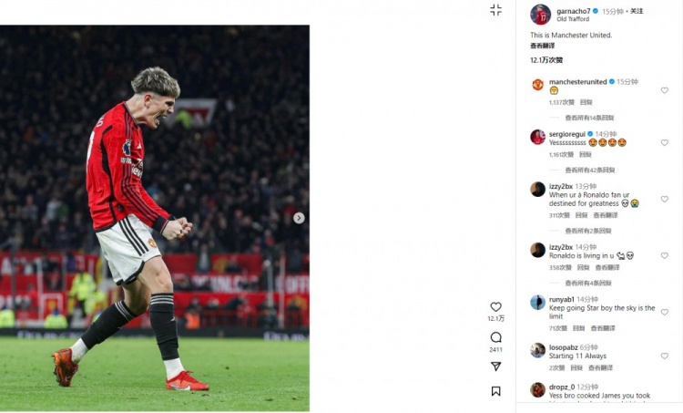 12月7日讯 英超联赛第15轮,曼联主场2-1力克切尔西,本场比赛加纳乔首发出战,并在比赛中助攻麦克托米奈打入第二球。赛后加纳乔更新个人社媒:这就是曼联。加纳乔