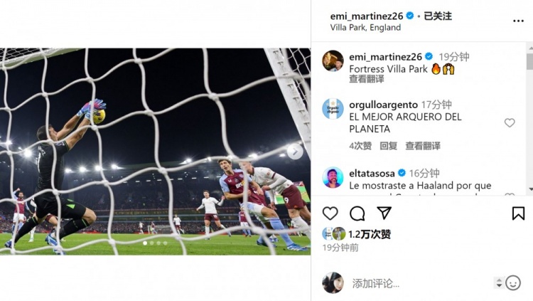赛后马丁内斯在社交媒体上晒出自己做出扑救的照片,并写道:“维拉公园堡垒