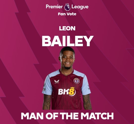 一击制胜!英超官方:利昂-贝利当选维拉1-0曼城全场最佳球员