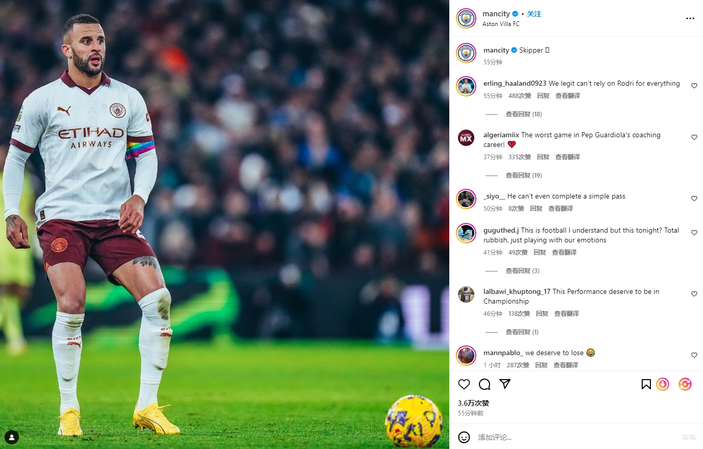 英超第15轮,曼城客场0-1不敌阿斯顿维拉遭遇英超4轮不胜,本场比赛维拉全场轰22脚打门,而曼城只有2脚。赛后曼城球迷们也在社交媒体上表达了对球队的愤怒。