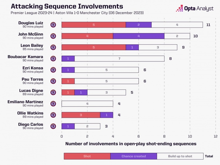 据Opta统计,此役维拉门将马丁内斯参与了4次以射门告终的进攻,多于曼城任何球员。本场参与有效进攻次数最多前10名皆为维拉球员,其中道格拉斯-路易斯居首(11次)。