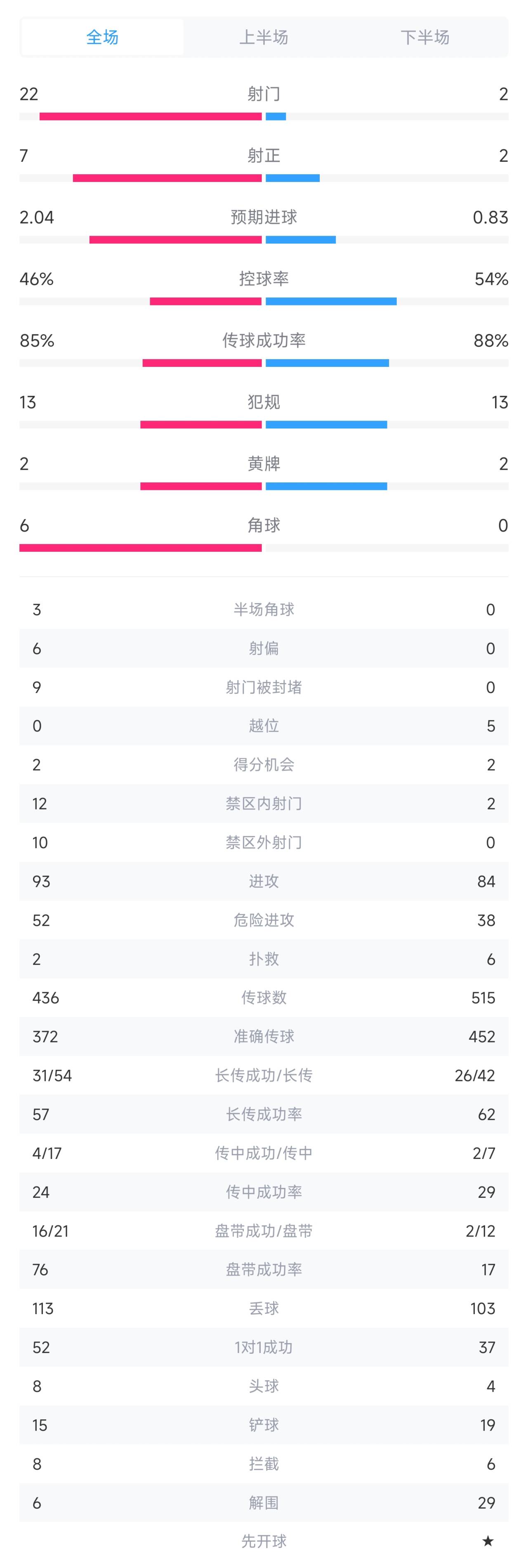 压着打!曼城vs维拉全场数据:维拉狂轰22脚,曼城仅2次射门
