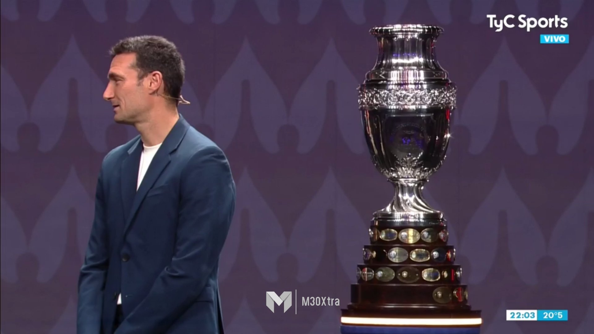 眼里全是爱!美洲杯抽签开始前,斯卡洛尼捧着新美洲杯奖杯出场