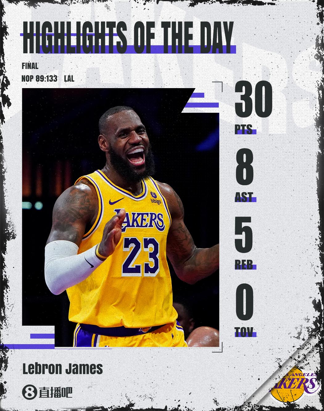 而同样38岁的詹姆斯(月底即将年满39岁)也延续着出色的表现!老詹昨日出战22分钟12中9爆砍30分5板8助0失误,帮助湖人在拉斯维加斯133-89大胜鹈鹕晋级NBA季中锦标赛决赛。