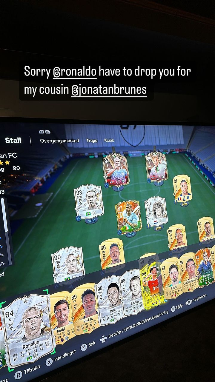 哈兰德晒EAFC24阵容:不好意思大罗,为了我堂弟只好把你放替补