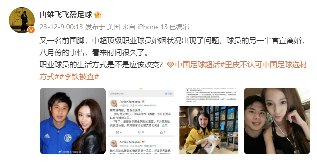 冉雄飞表示:“又一名前国脚,中超顶级职业球员婚姻状况出现了问题,球员的另一半官宣离婚,八月份的事情,看来时间很久了。