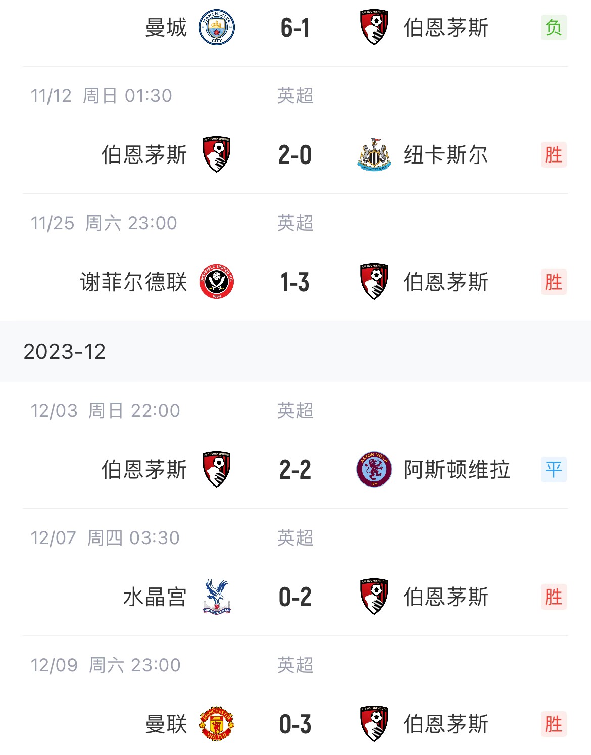 12月10日讯 本轮英超,伯恩茅斯客场3-0战胜曼联,联赛已5场不败。