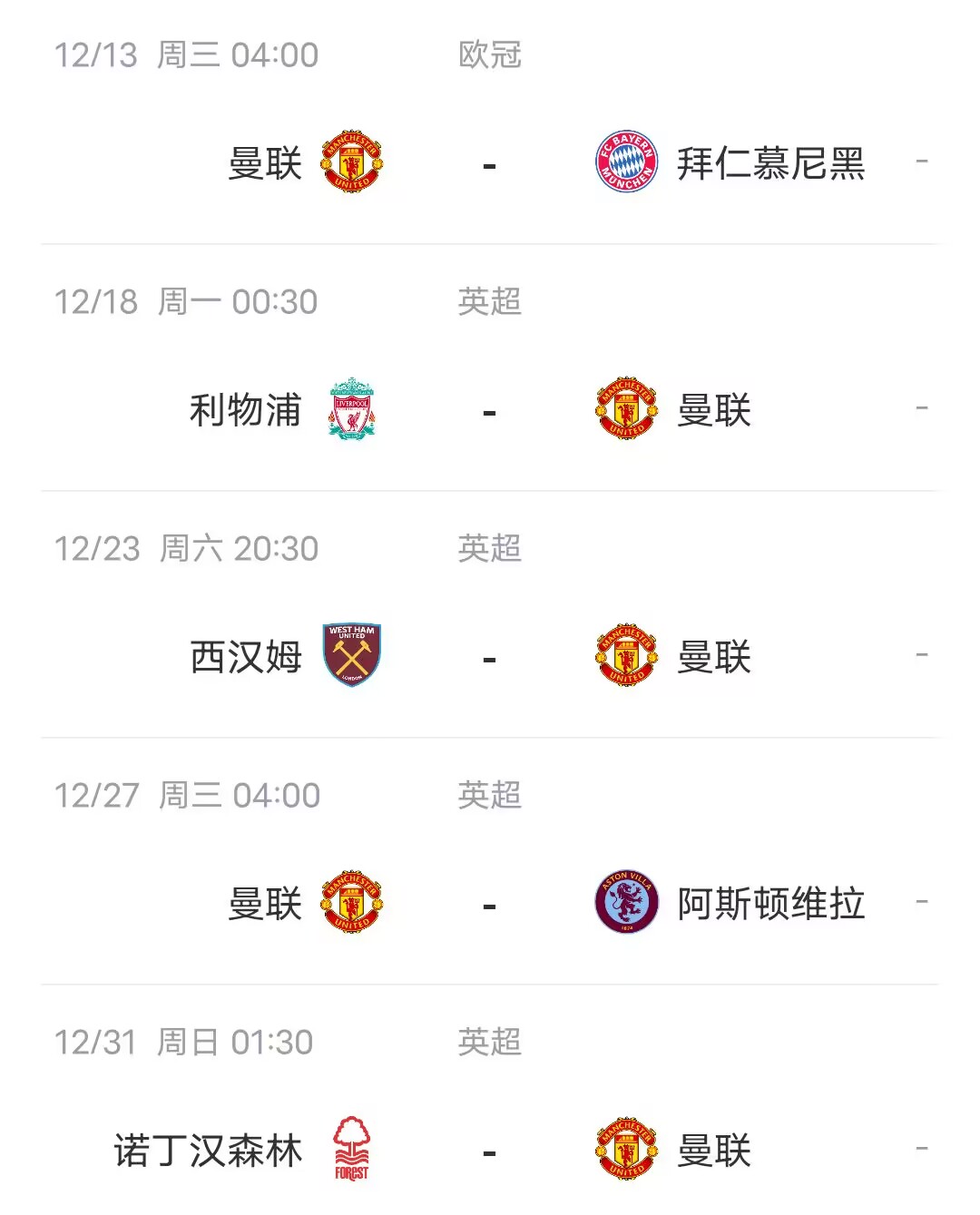 接下来,曼联将迎来一段魔鬼赛程:12月13日对阵拜仁,接下来是客战利物浦、西汉姆,战维拉...