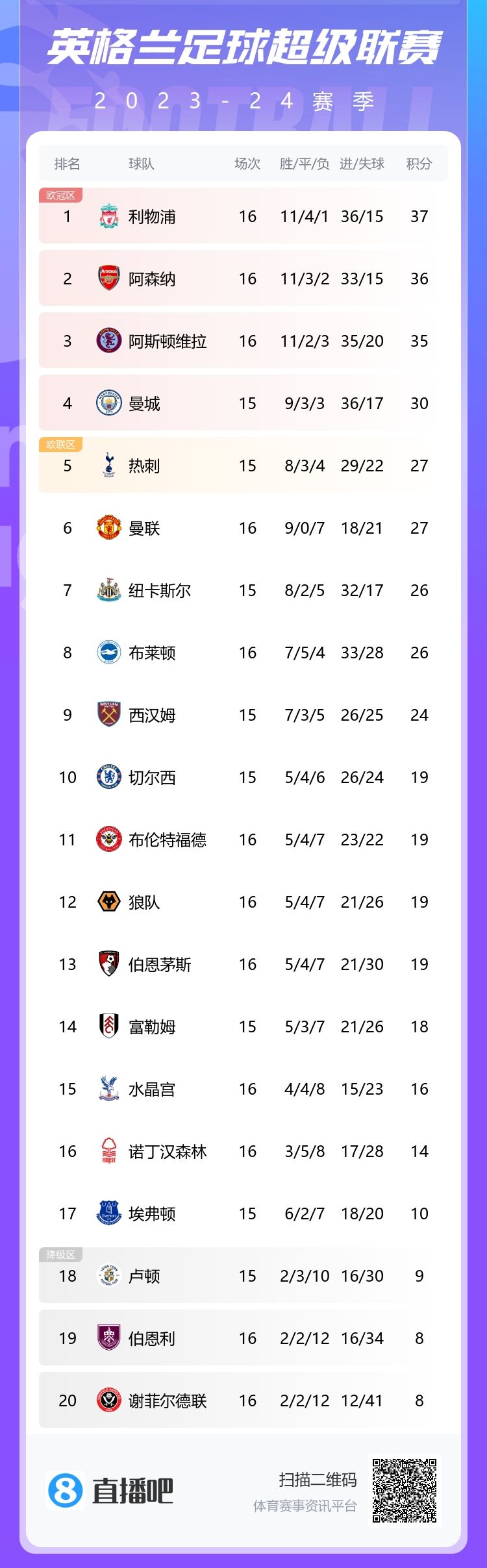12月10日讯 本轮英超结束部分比赛,利物浦37分高居第一!除切尔西外,传统BIG6都暂居英超前六!