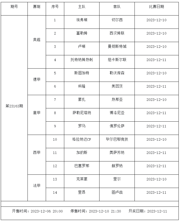 足球彩票胜负游戏(14场和任选9场)第23163期赛程: