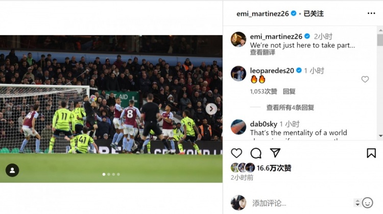 马丁内斯在社交媒体上晒出比赛照片,庆祝胜利,他写道:“我们来到这里并不仅仅为了参与。”
