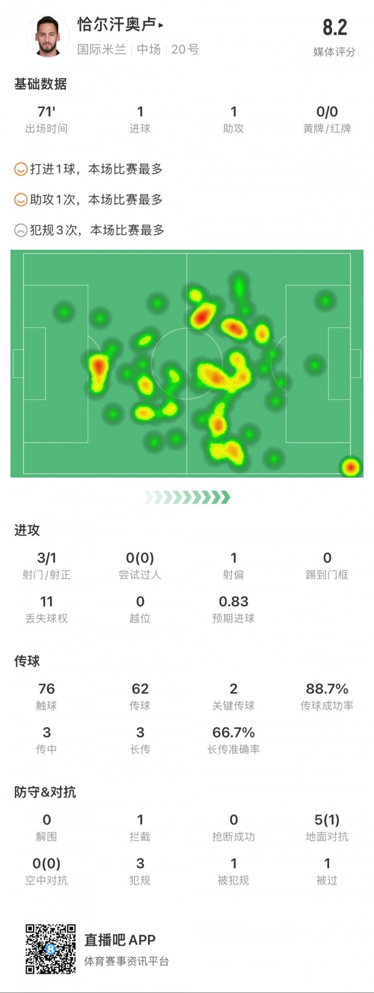 恰尔汗奥卢全场数据:1球1助,2次关键传球,获评8.2分