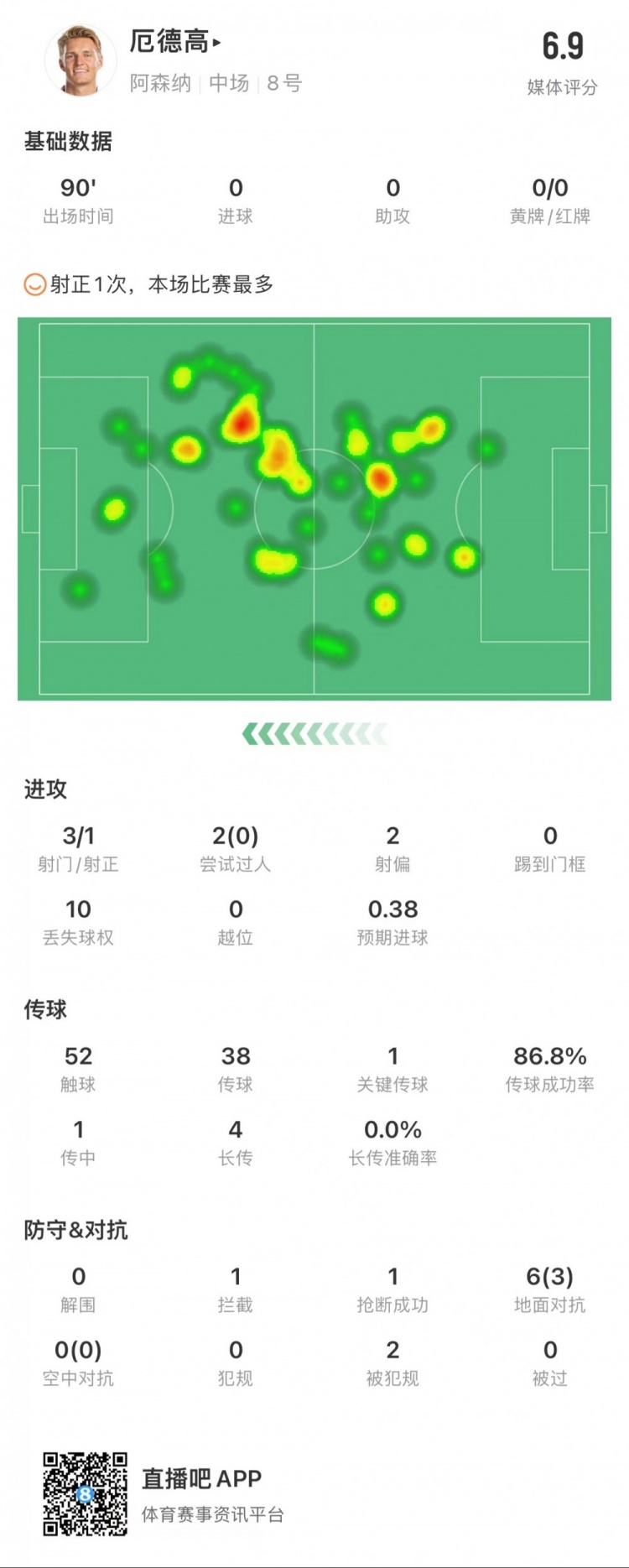 12月10日讯 英超第16轮,维拉主场1-0阿森纳。枪手队长厄德高全场数据: