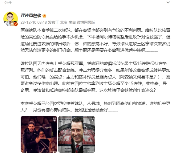 12月10日讯 本轮英超阿森纳客场0-1不敌阿斯顿维拉,赛后著名评述员詹俊在微博点评了这场比赛。