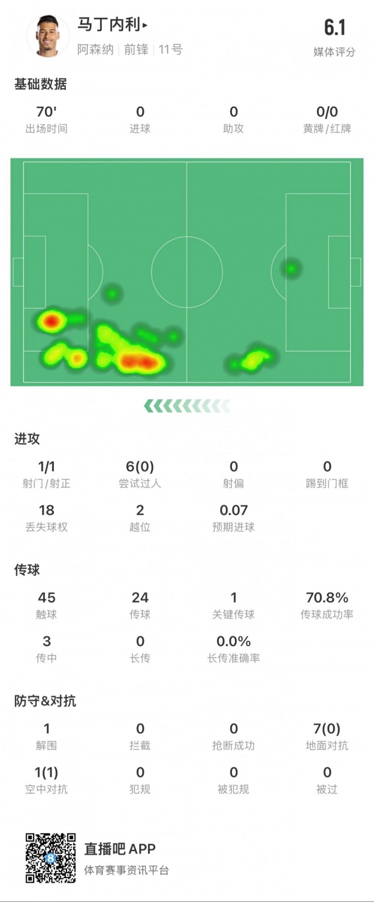 马丁内利本场数据:6次尝试过人0次成功,7次地面对抗0次成功