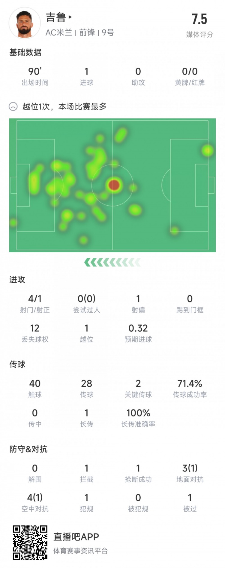 吉鲁本场数据:1次射正取得进球,2次关键传球,评分7.5全队最高