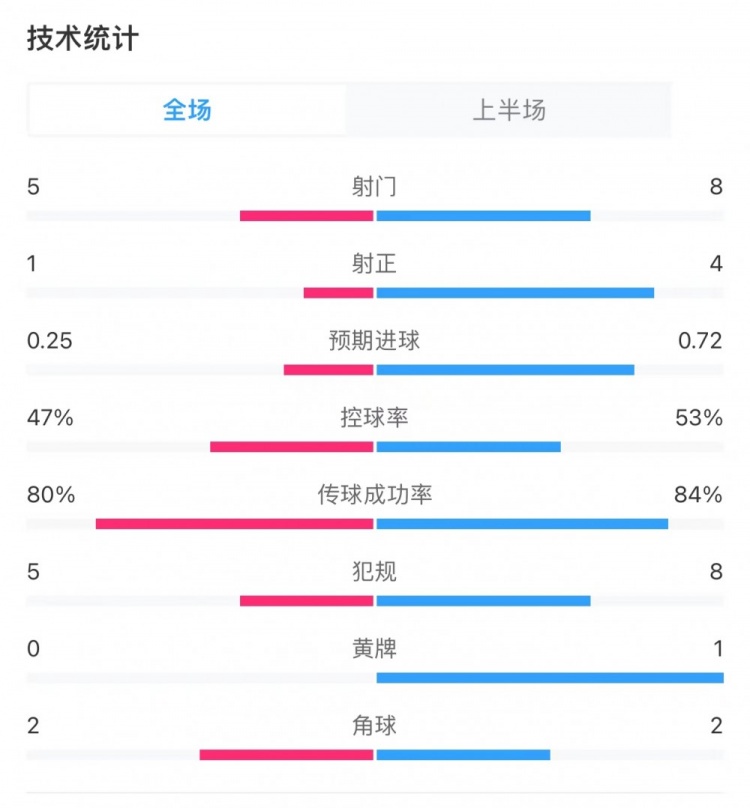 维拉1-0阿森纳半场数据:射门5-8,射正1-4,错失良机0-2