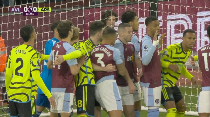 完蛋我被壮汉包围了阿森纳防守角球,拉亚被维拉球员团团围住