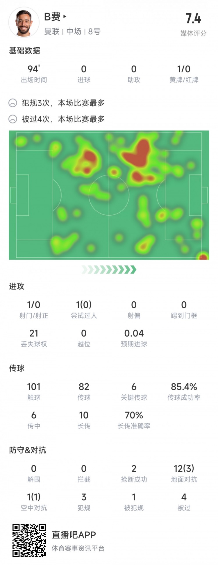B费本场数据:21次丢失球权,6次关键传球,13次对抗4次成功