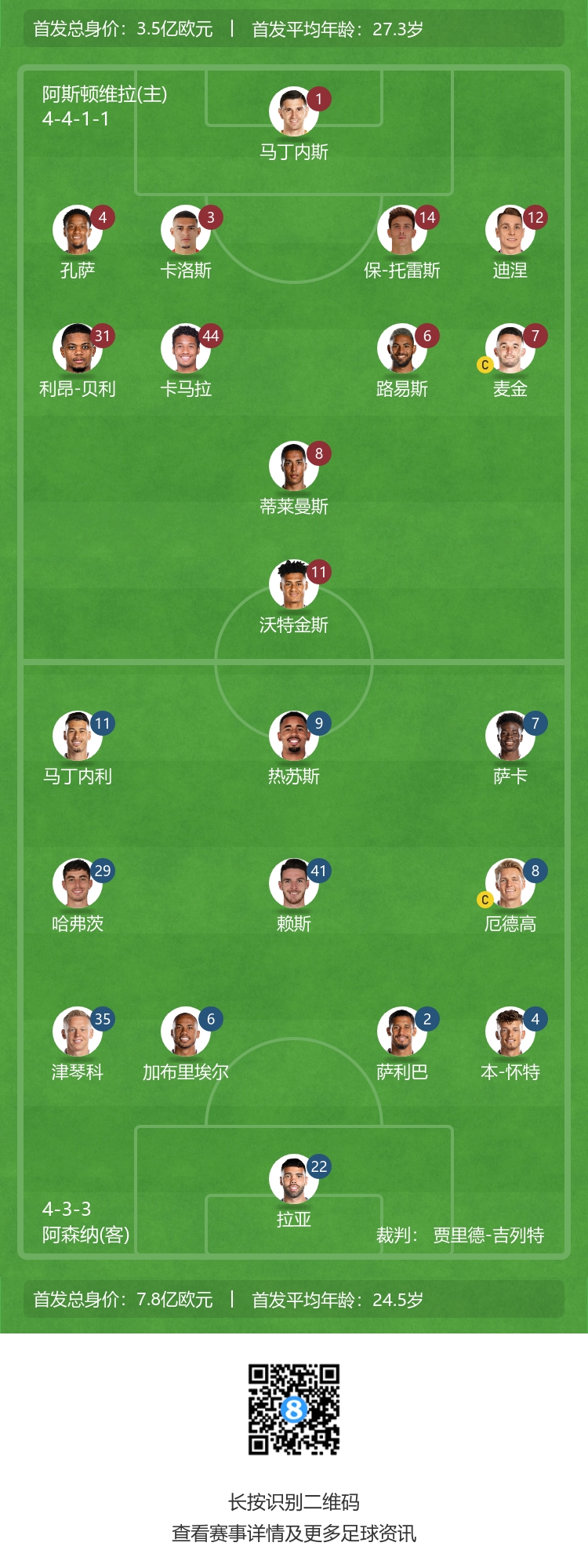 维拉首发:1-马丁内斯、4-孔萨、3-卡洛斯、14-保-托雷斯、12-迪涅、31-利昂-贝利、44-卡马拉、6-道格拉斯-路易斯、7-麦金、8-蒂莱曼斯、11-沃特金斯