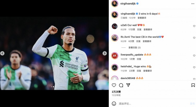这赛程不容易!范迪克社媒:6天时间里拿下了第3场胜利