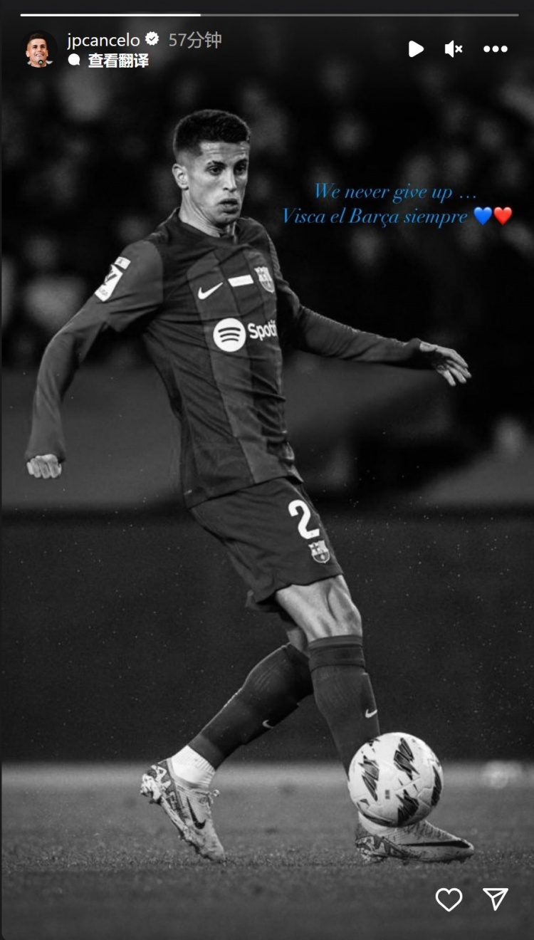 赛后坎塞洛在社交媒体上晒出自己的比赛照片,并配文:“我们永不放弃,巴萨万岁!”